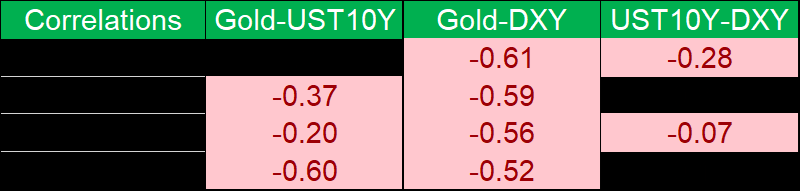 Infine, se vista in termini di correlazioni, la forte correlazione negativa dell'Oro con il dollaro USA è stata persistente nell'ultimo anno, ma la sua correlazione con il rendimento del Treasury a 10 anni è diventata positiva nell'ultimo mese. Ciò significa che se il Treasury USA ha riportato ultimamente una maggiore resa agli investitori, l'Oro ha mantenuto il suo fascino (v. grafico delle correlazioni tra l’ORO ed il Treasury UST, l’ORO ed il Dollaro Index DXY):