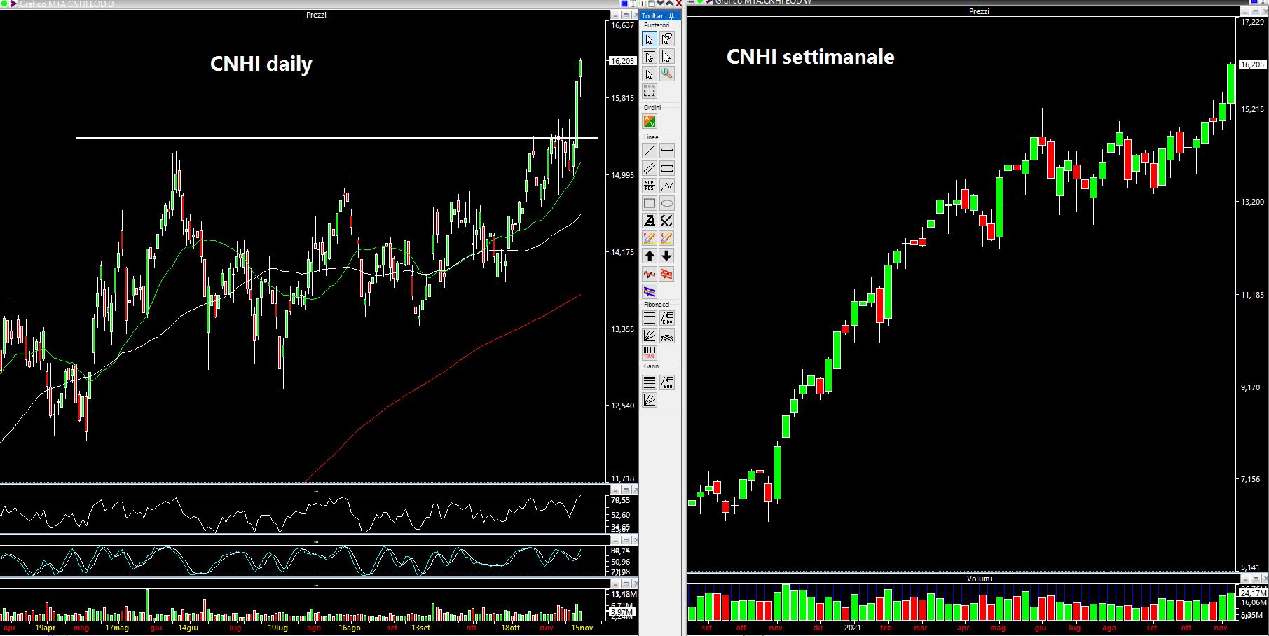 E' quindi lecito pensare che con lo spin-off (o separazione) di Iveco da CNHI si possa creare valore e quindi pensare che CNHI continui a salire nelle prossime settimane, tanto più che graficamente si assiste ad una rottura continua dei massimi storici. Come calibrare lo stop in questi casi? Riducendo la size ed ipotizzando di non tornare sotto i 15 euro, magari scaglionando gli acquisti in più tranches ed andando alla ricerca di piccoli ritracciamenti che talvolta si verificano in intraday.