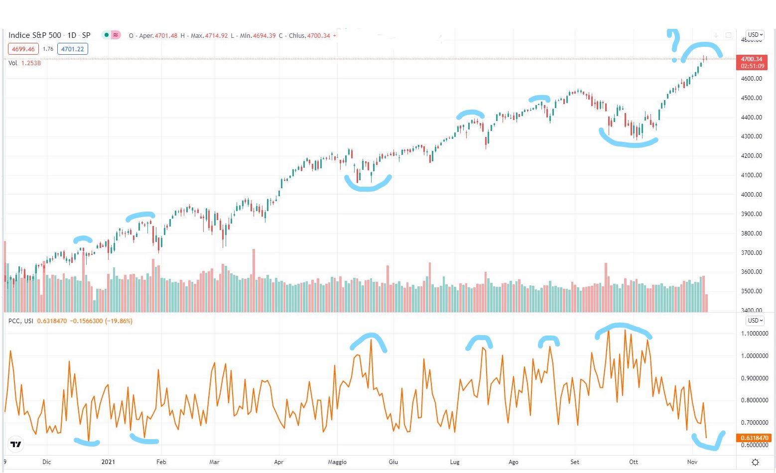 In settimana abbiamo avuto un pò di storno sui principali indici a stelle e strisce. Nulla di preoccupante al momento e credo che il motivo sia da ricercare nel rapporto put/call ratio. Il grafico di seguito rappresenta la situazione di martedì 9 novembre (lo avevo mandato ad un amico come alert di brevissimo). Purtoppo volevo scrivere due righe su questa rubrica ma ho avuto un imprevisto e quindi non l'ho fatto. Di fatto il mercato era sbilanciato sul lato ribassista, anche se questo NON è un indicatore di timing. Si tratta di un indicatore che mostra il volume delle opzioni put rapportato a quello delle call. Un valore del rapporto maggiore di 1 indica che le put aperte sono maggiori delle call, mentre un valore sotto 1 il contrario. Se il rapporto è molto alto il mercato è orso e viceversa. Personalmente lo osservo sui valori estremi: sui massimi abbiamo un potenziale bottom di mercato mentre sui minimi un potenziale top di mercato (ragionando sul breve periodo).