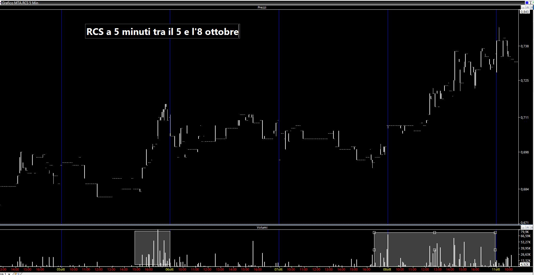 Di seguito il grafico a 5 minuti del titolo RCS nelle sedute comprese tra il 5 e l'8 ottobre quando sono avvenuti gli acquisti da parte di Urbano Cairo (Fonte: IlSole24ore).