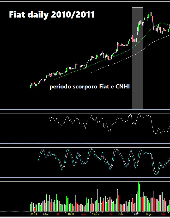 In settimana è stata diffusa la notizia ed ufficializzato il prosetto che a partire dal 3 gennaio 2022 CNH Industrial scinderà Iveco quotandola a Piazza Affari. CNHI ed Iveco diventeranno quindi due società quotate ed indipendenti. La notizia dello spin-off è stata accolta molto positivamente. Gli azionisti CNHI riceveranno così una azione iveco ogni cinque azioni CNHI detenute al momento della scissione. Una scissione che dovrebbe (il condizionale è sempre d'obbligo, ma Iveco è comunque considerata un gioiellino) portare valore agli azionisti. Andando MOLTO a ritroso nel tempo sono andato a cercare il momento in cui ci fu lo scorporo di Fiat (ora Stellantis) e CNHI nel lontano 2011 anche in questo caso nella prima seduta dell'anno. Questo era stato il comportamento di Fiat nei mesi immediatamente antecedenti (grafico seguente su scala daily):