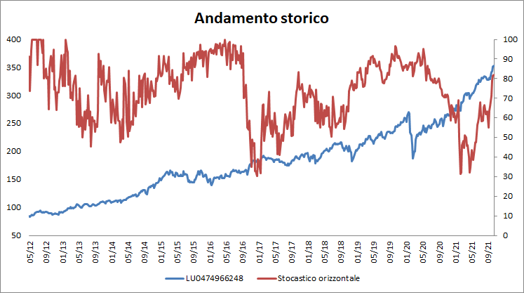 Ho preso in considerazione poco meno di 50 asset espressi in euro e con uno storico almeno decennale, mentre ho effettuato una prima scrematura utilizzando, come sempre, i dati cumulati dello Stocastico orizzontale. Il fondo scelto ha qualche particolarità che ritengo interessante.