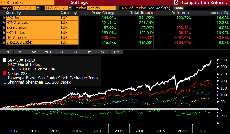 Sopra, i rendimenti comparativi degli ultimi 10 anni, espressi in euro, di alcuni indici internazionali, presi qua è la, e osserviamo la sovra performance dell’indice americano Sp500.