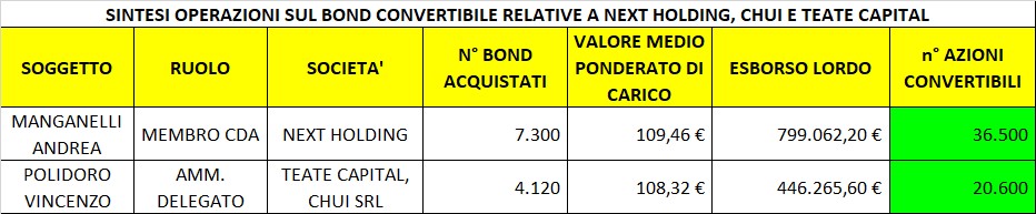Il Consigliere-socio Manganelli (azionista di maggioranza relativa), nel medesimo periodo, ha venduto n° 37.717 azioni per € 867.491 ed ha acquistato per € 799.062 n° 7.300 bond (convertibili in 36.500 azioni).