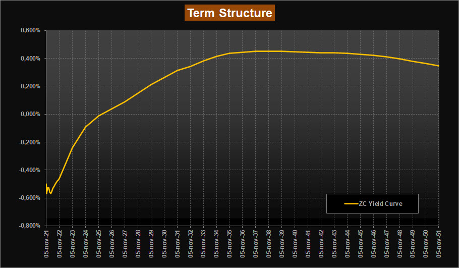 La lettura della ZC-Yield Curve mostra un deciso rialzo dei rendimenti sul tratto a medio, mentre indica un’altrettanta decisa contrazione dei rendimenti sul tratto a lunga. Infatti, rispetto alla scorsa analisi il rendimento della scadenza a 10 anni esplode attestandosi oltre lo 0,30% rispetto allo 0,17% di un mese fa, mentre la scadenza trentennale cala vistosamente portandosi allo 0,35% rispetto a oltre lo 0,50% del mese scorso. Prosegue a modificarsi anche la curva, con la parte a breve e medio ora più ripida, per poi a appiattirsi e assumere inclinazione negativa sulle scadenze lunghe. La curva evidenzia ora un massimo di rendimento sempre sulle scadenze 2037-2039, in contrazione rispetto alla scorsa analisi, passando all’attuale area 0,45% dalla precedente 0,54% di rendimento. Salgono i tassi forward su Euribor 6 mesi sul tratto a breve, con un’impennata notevole per le scadenze al 2023. Ora, infatti, la curva fornisce previsione di tassi positivi già da fine 2023 rispetto al 2025 del mese scorso e soprattutto rispetto al 2027 osservato nel mese di settembre. Il tratto a lunga si ridimensiona invece un po’ portandosi ad un picco dello 0,80% per il 2033 per poi scivolare addirittura sotto lo 0,50% per scadenze al 2038.