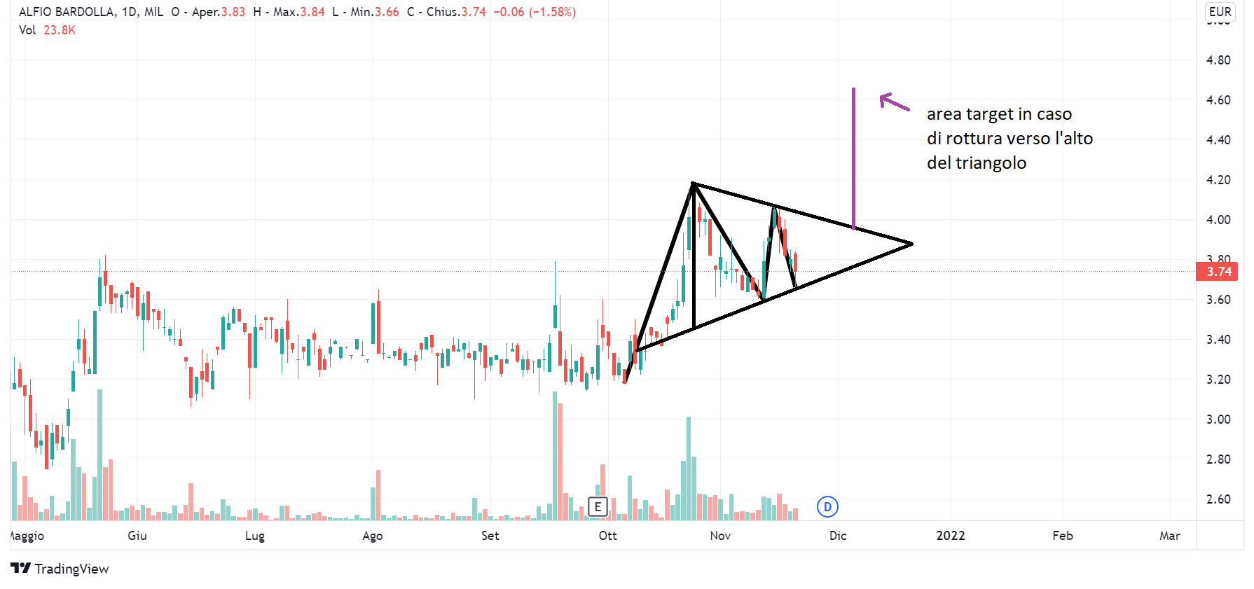Da monitorare il titolo Alfio Bardolla (venerdì Lombard Stock Index di 25). In questo caso segnaliamo quelli che sono i primi movimenti di un possibile triangolo simmetrico. Per il momento sul grafico vediamo il massimo di 4,18 del 25 ottobre, il minimo di 3,60 toccato il 10 e l’11 novembre, il secondo massimo di 4,06 del 15 novembre e quello che per ora, alla chiusura di venerdì, è il secondo minimo, ovvero la quotazione di 3,66 registrata il 19 novembre. Alfio Bardolla Training Group è una società che si occupa di formazione finanziaria personale; al 30 giugno 2021 ha raggiunto ricavi per 7,2 milioni di euro (contro i 5,1 milioni di euro al 30 giugno 2020 ed i 5,5 milioni di euro del primo semestre 2019) ed un EBITDA di 2,2 milioni di euro (contro gli 1,2 milioni di euro al 30 giugno 2020).