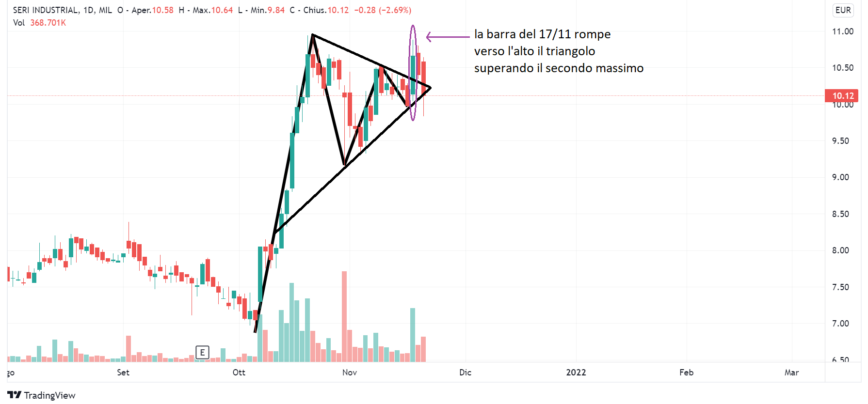Nell’ultimo articolo dedicato al Lombard Stock Index avevamo presentato la situazione grafica di Seri Industrial e Carel Industries. Situazione grafica che per entrambi i titoli si è evoluta negli ultimi giorni. Vediamo come partendo da Seri Industrial (venerdì Lombard Stock Index di 40). Il triangolo simmetrico formato da due massimi, uno di 10,94 (20 e 21 ottobre) e l’altro di 10,52 (9 novembre), e due minimi, uno di 9,15 (29 ottobre) e l’altro di 9,96 (16 novembre), è stato rotto il 17 novembre con una barra che ha toccato una quotazione di 10,88.