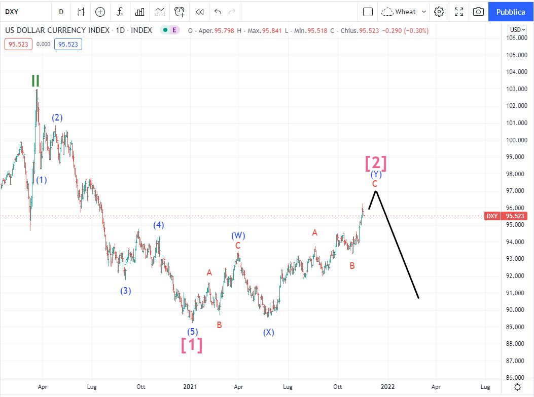 Se quella in atto fosse un’onda 2 potrebbe scendere fino al minimo di onda 4. Sotto il modello salterà e allora si dovrà indossare il berretto dei ribassisti.