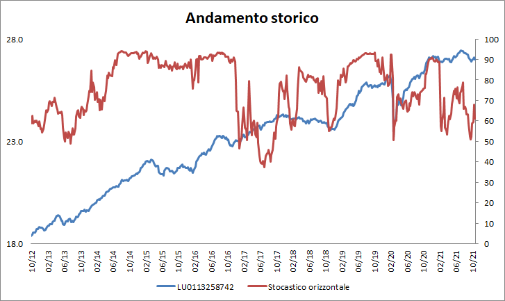 Lo Stocastico orizzontale si è mantenuto per il 64% del periodo al di sopra di 70 ciò che significa che, per circa 6,4 anni dei 10 presi in esame, l’asset è stato tra i fondi più performanti (a 52 settimane) rispetto agli altri asset del mio paniere di riferimento.