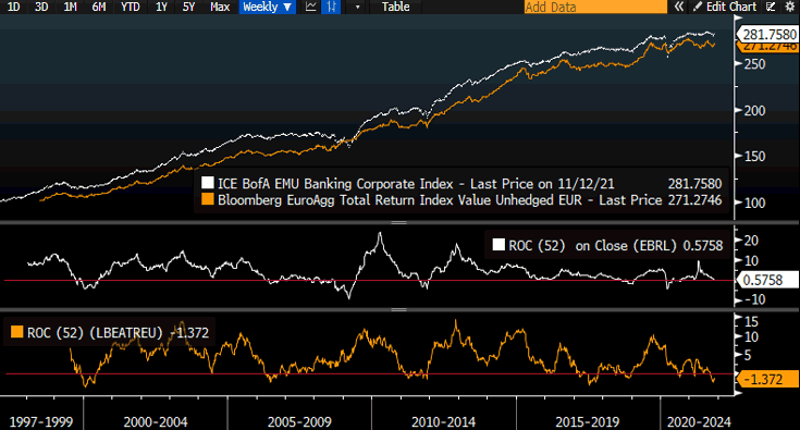 Anche il benchmark ICE BofA EMU Banking Corporate Index (in bianco) che utilizzerò oggi (EBRL Index) è collocato poco al di sotto dei massimi assoluti, ma riesce a rosicare una variazione positiva a un anno di +0,57%. Tuttavia, anche in questo caso, la variazione dall’inizio dell’anno è negativa di -0,40%.