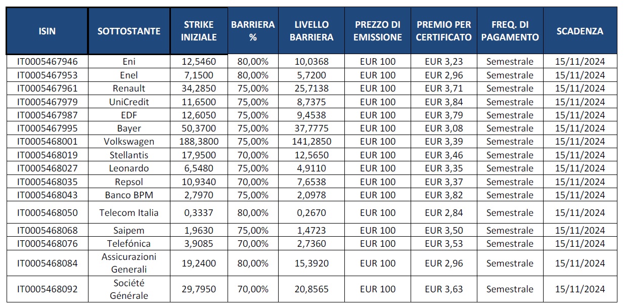 Quotati sul mercato SeDeX di Borsa Italiana i 16 nuovi Cash Collect prevedono la possibilità di ottenere premi semestrali condizionati dall’andamento dell’azione sottostante in presenza di rialzi, stabilità o ribassi da maggio 2022 a novembre 2024 entro livelli barriera indicati nella tabella sottostante.