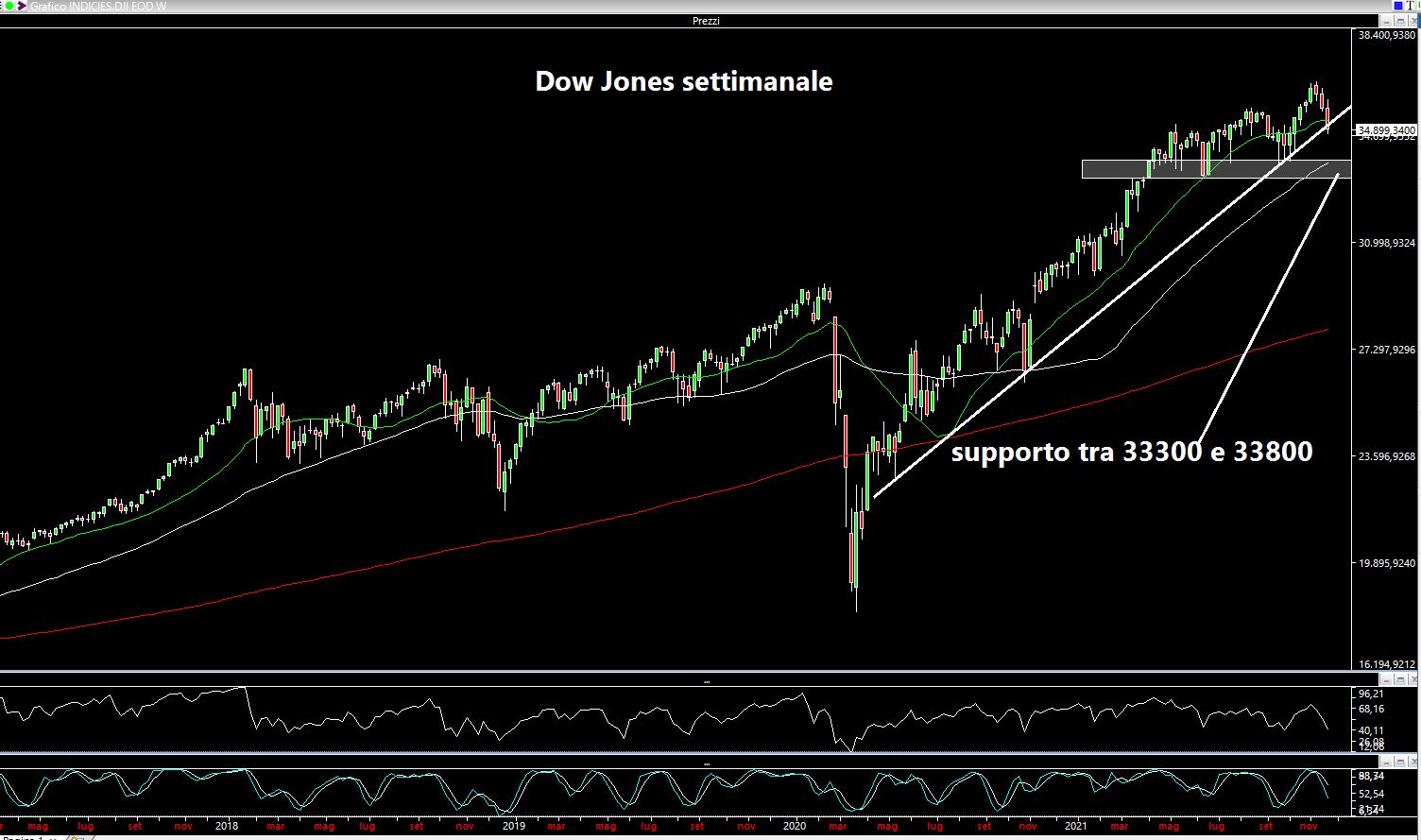 Procederei analizzando i principali indici per le prossime cinque sedute. Credo che le sedute chiave (mai chiavi in mano naturalmente) saranno quelle di lunedì e di martedì. Quello che mi piacerebbe? Un ulteriore ribasso lunedì e un rimbalzo martedì, magari a "rimangiarsi" il ribasso del giorno prima. Quello che non mi piacerebbe vedere? Un ribasso lunedì ed un ribasso martedì. Senza voler entrare troppo nel dettaglio, capita spesso che le inversioni di trend (da ribassista a rialzista almeno nel breve termine) possano verificarsi quando il venerdì e/o il lunedì sono fortemente negativi (magari con delle code delle candele nei giorni precedenti) e poi si sale dal martedì. Ma c'è un problema: la mia analisi è condotta sugli USA e la seduta di venerdì secondo me NON è stata poi così negativa come in Europa. Insomma, tacchino di traverso ma non ancora una indigestione. E consideriamo anche che esiste la logica del "tanto peggio quanto meglio": le Banche Centrali sono sempre vigili e quindi il peggioramento della situazione potrebbe portare ad un aumento della droga iniettata nel sistema (la liquidità), spostando nuovamente il focus del mercato dall'inflazione alla "Covid phobia o mania".