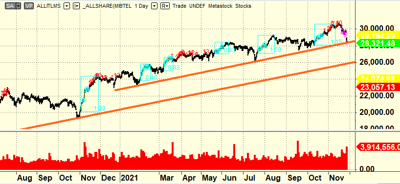 A livello tecnico il nostro indice Ftse All share ha retto la botta e se fosse vero quello di cui sopra sarebbe una buy opportunity colossale per comprare azioni a prezzi stracciati: guardate come la chiusura di venerdì sia a cavallo della trendline che passa poco sotto (breve periodo) mentre ci sia spazio ancora per la trendline di lungo periodo: