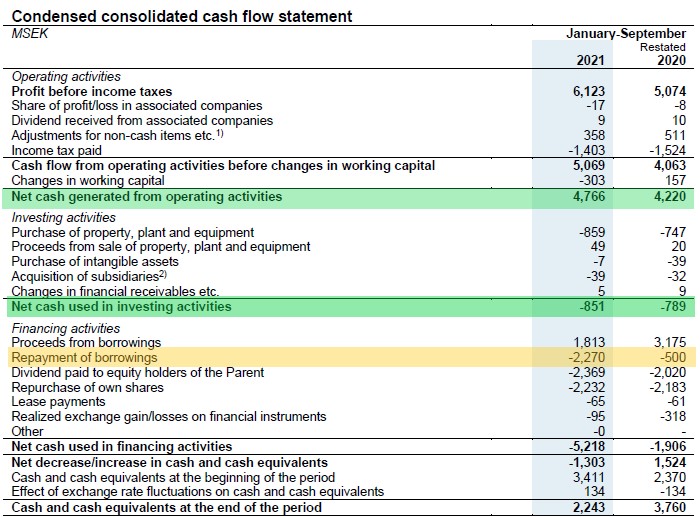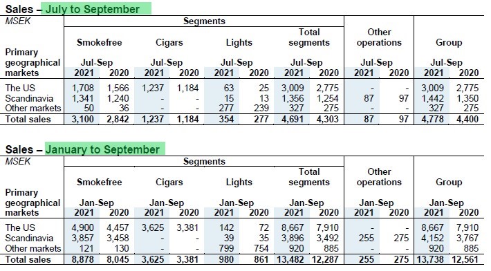 Nei primi nove mesi del 2021, il core business di SWEDISH MATCH, come di consueto, ha generato copiosi flussi di cassa operativi che sono passati da 4.220 MSEK a 4.766 MSEK (+13%).