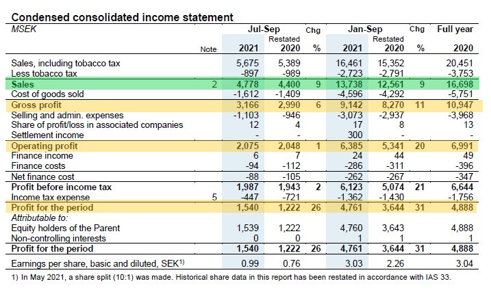 L'utile al netto delle imposte relativo al terzo trimestre è stato pari a SEK 1.540 mln (+26%): va sottolineato però che, il risultato del 2020 era condizionato da un aggravio straordinario di SEK 286 mln.