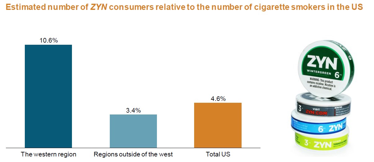 ZYN rappresenta uno dei prodotti di maggior successo per SWEDISH MATCH. Dall’immagine che segue si comprende facilmente che le dimensioni del mercato siano ancora ben lontane dalla saturazione: solamente il 4,6% della popolazione USA, al momento, fa uso del prodotto.