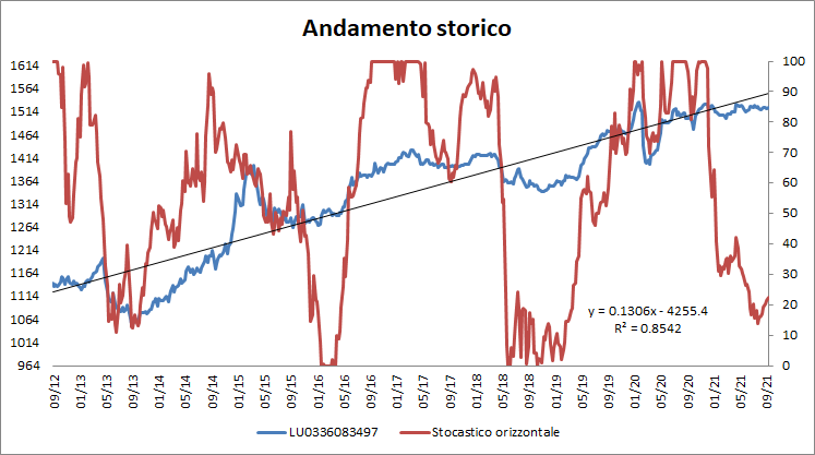 Ho preso in considerazione poco meno di 30 asset con uno storico almeno decennale, mentre ho effettuato una prima scrematura utilizzando, come sempre, i dati cumulati dello Stocastico orizzontale. Il fondo scelto ha qualche particolarità che ritengo interessante.