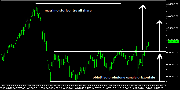Ma bando agli scherzi e veniamo al grafico dei grafici: se notate il grafico mensile del Ftse All Share mostra quello che sognavamo da sempre: la rottura del canale orizzontale che ci tiene imprigionati dal lontano 2008. Se proiettate l'ampiezza del canale verso l'alto vedete che arriviamo nei pressi del massimo storico, e se poi aggiungete il fatto che i massimi storici attirano sempre come calamite i prezzi possiamo concludere che ci aspettiamo un 40.000 del Ftse All share molto rapidamente, diciamo entro Pasqua dell'anno prossimo se non addirittura prima.