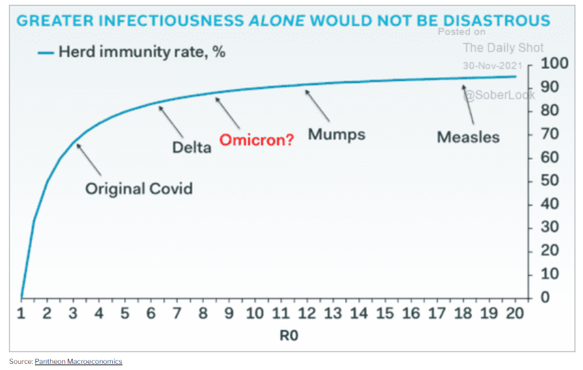 Un altro grafico mostra con precisione come sia la relazione funzionale tra la infettività di Omicron e l’immunità di gregge: la conclusione è che una maggiore infettività quando tutti sono vaccinati non cambierebbe certamente le carte in tavola, anzi sarebbe assolutamente ininfluente.