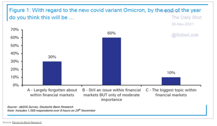 La Borsa è scesa perché doveva scendere. Non per la variante Omicron. Se questa discesa dei prezzi sarà una buy opportunity lungo la via di nuovi massimi o semplicemente l’inizio di un ritracciamento più profondo lo sapremo presto. Questo articolo è destinato a smentire che la variante Omicron abbia qualcosa da fare con il ritracciamento in corso. Fin da subito se leggevate in tempo reale il flusso di informazioni relativamente ad Omicron una notizia era negativa e altre 9 propendevano per una variante molto meno pericolosa della delta: alta infettività, è vero, ma bassa sintomatologia. E i vaccini resistevano bene (vedi caso del paziente zero di Caserta o degli studi israeliani). Fa parte del meccanismo normale della Borsa che la maggior parte dei media e dei market player si concentri su notizie che sono ormai superate dagli eventi e la cosa negativa è che spesso questi timori non suffragati da ipotesi concrete vengano avallate da organismi istituzionali. E qui avviene il cortocircuito perché pure io stesso se leggo che un organismo istituzionale prende posizione penso subito “beh se lo dicono loro allora vorrà dire che … “. Purtroppo gli organismi istituzionali sbagliano anche loro e lo abbiamo visto tante volte nel corso di questa pandemia. Che i timori per Omicron siano eccessivi lo dimostra un sondaggio condotto da Deutsche Bank per la quale i mercati hanno già dimenticato Omicron: