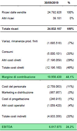 In termini di EBITDA, la crescita piatta del volume d’affari è stata però accompagnata da un contestuale miglioramento della marginalità: in termini assoluti si è passati da € 1,77 mln a € 4,04 mln. Conseguentemente a ciò, l’EBITDA MARGIN % è aumentato dal 15,8% al 20,2%.