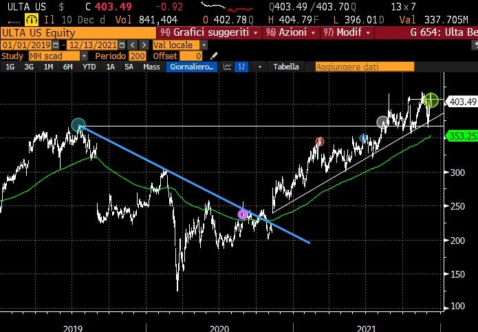 ULTA BEAUTY, dopo la convincente trimestrale commentata nel precedente articolo (https://www.lombardreport.com/2021/12/4/in-usa-la-cosmetica-galoppa/) si è riportata in prossimità dei massimi storici (+70,23 dalla segnalazione).