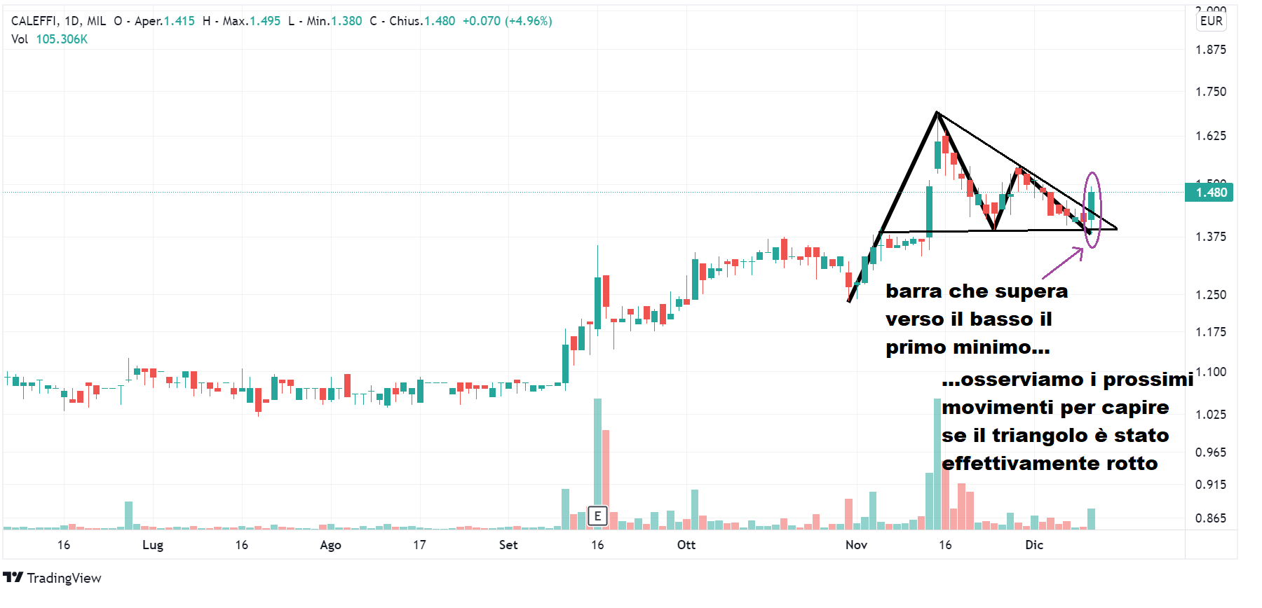 Evoluzione grafica diversa per il titolo Caleffi (sabato Lombard Stock Index di 27). Nel nostro ultimo articolo avevamo presentato un triangolo simmetrico dato da due massimi decrescenti di 1,69 (15 novembre) e 1,54 (29 novembre) e due minimi crescenti di 1,39 (24 novembre) e di 1,425 (3 dicembre). In realtà nel corso della settimana quest’ultimo minimo è stato superato verso il basso e venerdì 10 dicembre è stato registrato un minimo di 1,38, vale a dire una quotazione inferiore al primo minimo del triangolo. Da osservare i successivi movimenti, per capire se effettivamente si potrà affermare che il triangolo è stato rotto verso il basso.