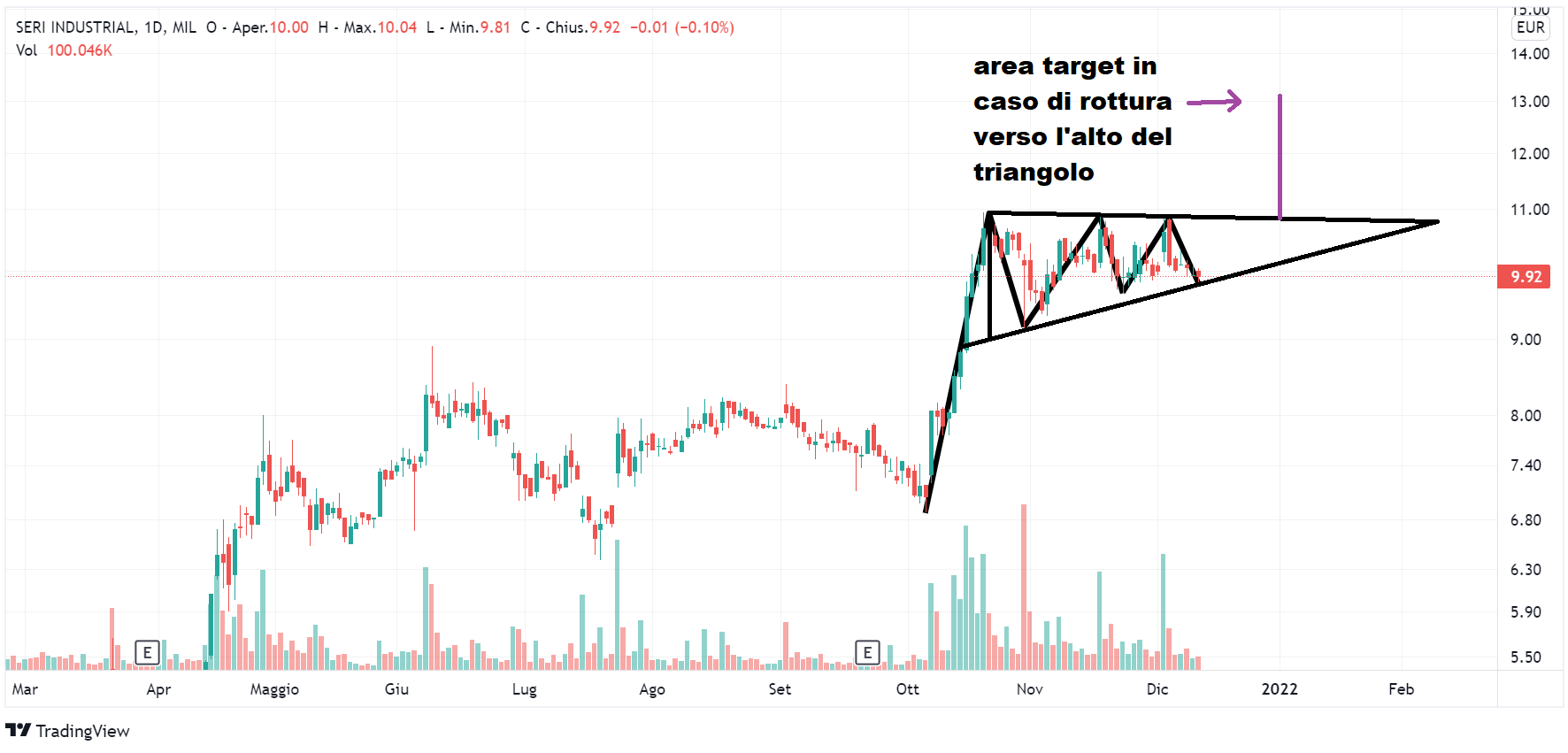 Movimento interessante sul grafico di Renergetica (sabato Lombard Stock Index di 52). È ancora presto per parlare di un triangolo, però possiamo segnalare alcune cose su questo titolo. Innanzitutto si nota un corposo aumento dei volumi nelle sedute del 2, 3 e 4 novembre. In corrispondenza di questo aumento dei volumi vediamo un rialzo della quotazione, che arriva a toccare un massimo di 8,30 il 5 novembre. A seguire la quotazione scende fino al minimo di 6,48 del 26 novembre, poi c’è una breve fase di lateralizzazione e una piccola spinta verso l’alto fino a raggiungere quello che per il momento è il secondo massimo, ovvero la quotazione di 7,28 dell’8 e 9 dicembre. Renergetica opera nel settore delle energie rinnovabili; nel primo semestre 2021 ha realizzato ricavi per 5,3 milioni di euro, in calo rispetto ai circa 5,6 milioni di euro al 30 giugno 2020. Contrazione anche per l’EBITDA che al 30 giugno 2020 era pari a circa 2,6 milioni di euro, mentre al 30 giugno 2021 è di circa 2,1 milioni di euro.