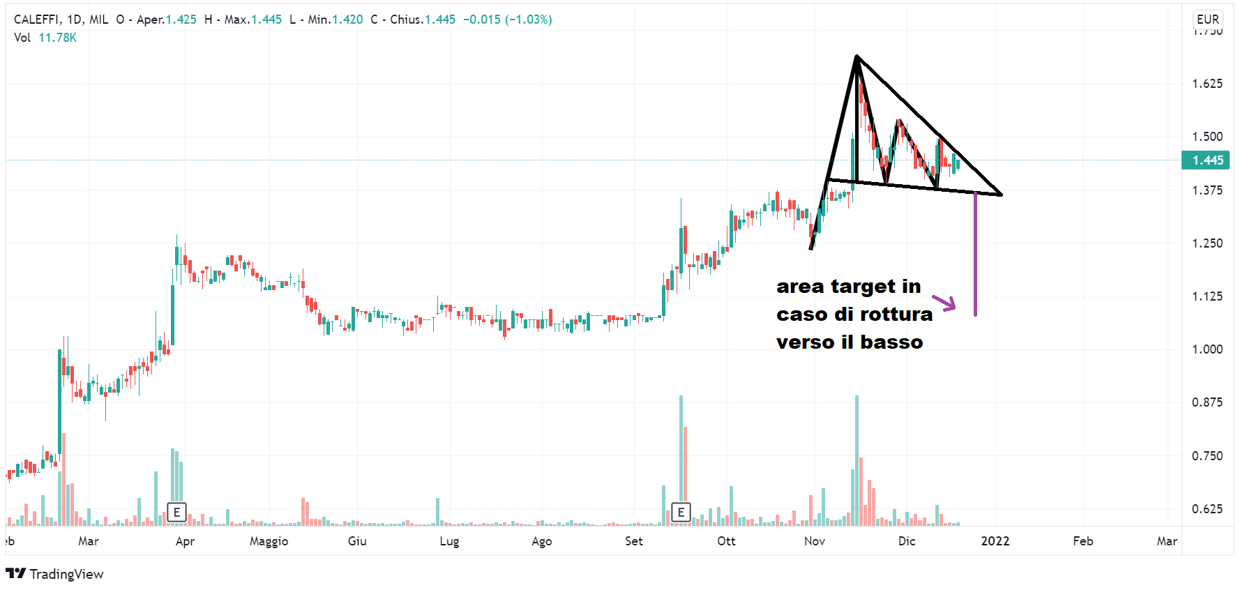 Della situazione grafica di azioni Caleffi (venerdì Lombard Stock Index di 23) abbiamo già parlato, ma questa settimana vogliamo partire proprio da un aggiornamento riguardo questo titolo. Nell’ultimo articolo avevamo segnalato come il minimo di 1,38 (10 dicembre) avesse superato verso il basso il minimo precedente di 1,39 (24 novembre). Potenzialmente potevamo trovarci di fronte ad una rottura del triangolo che avevamo ipotizzato. Osservando l’evoluzione grafica delle sedute successive, tuttavia possiamo dire che questa rottura non c’è stata, il movimento laterale non si è fermato. Allora con due minimi praticamente allineati (1,39 del 24 novembre ed 1,38 del 10 dicembre) possiamo parlare di un triangolo discendente che, oltre ad appoggiarsi sui minimi già citati, presenta tre massimi decrescenti di 1,69 (15 novembre), 1,54 (29 novembre) e 1,495 (13 dicembre).
