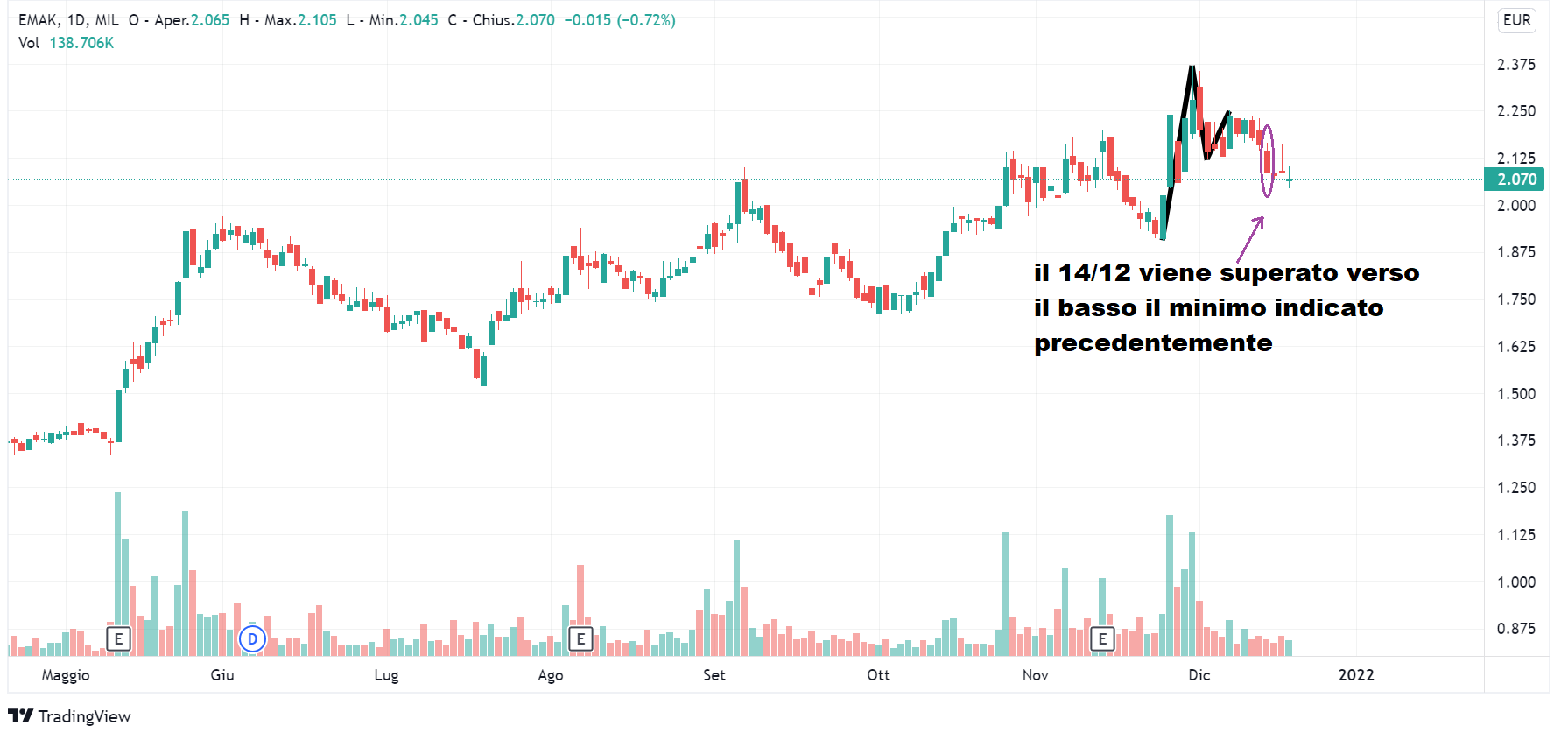 Per quanto riguarda Emak (venerdì Lombard Stock Index di 20), nell’ultimo articolo avevamo segnalato la presenza di un triangolo in formazione dato dal primo massimo di 2,37 del 30 novembre, dal minimo di 2,12 del 2 dicembre e dal secondo massimo di 2,25 del 7 dicembre. Nelle sedute successive c’è stata una lateralizzazione, fino al 14 dicembre, data in cui è stata toccata una quotazione di 2,085, quindi sotto al primo minimo segnalato. In conclusione, il triangolo in formazione che avevamo segnalato sembra non aver avuto seguito.