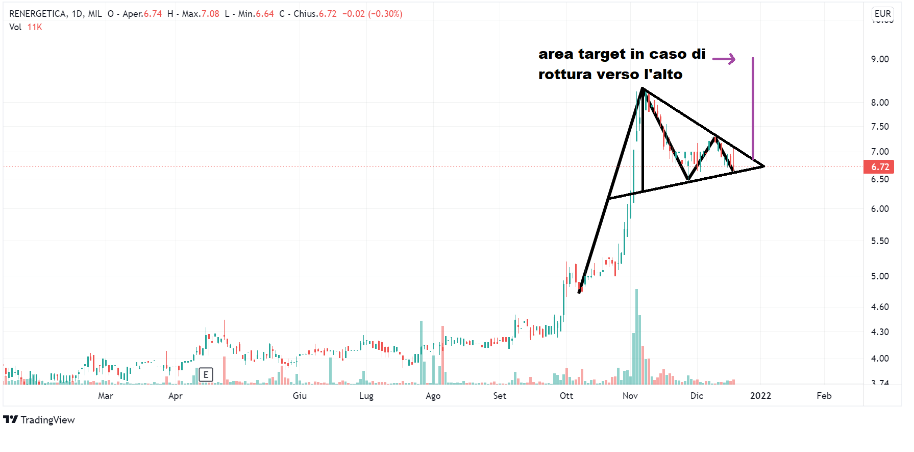 Prende forma, invece, il triangolo sul grafico di Renergetica (venerdì Lombard Stock Index di 47). Dal primo massimo di 8,30 del 5 novembre, passiamo al minimo di 6,48 del 26 novembre e poi al massimo di 7,28 dell’8 e 9 dicembre, che si è confermato essere il secondo massimo, dato che nelle sedute successive la quotazione è scesa, toccando quello che per il momento è il secondo minimo in data 17 dicembre (quotazione di 6,64).
