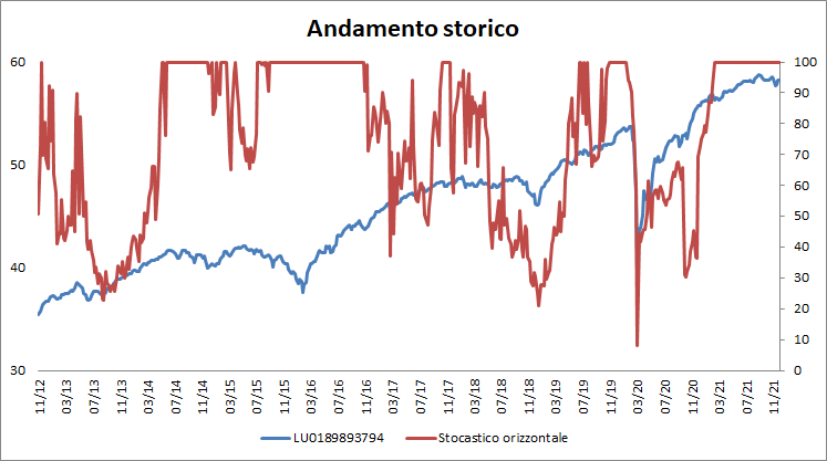 Lo stocastico orizzontale del fondo si è mantenuto per il 59% del periodo preso in considerazione al di sopra di 70 e, di conseguenza, è stato spesso individuato tra gli asset che presentavano le migliori performance a 52 settimane.