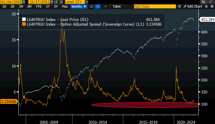 L’indice Bloomberg Global HYxCMBSxEMG 2% Cap Total Return Index Value Unhedged USD, per gli amici LG40TRUU Index, sarà il nostro benchmark odierno, mentre si trova in relativa difficoltà dallo scorso ferragosto. Al momento, niente di preoccupante se prendiamo in considerazione l’importante rialzo messo a segno dopo il primo lookdown di marzo 2020.