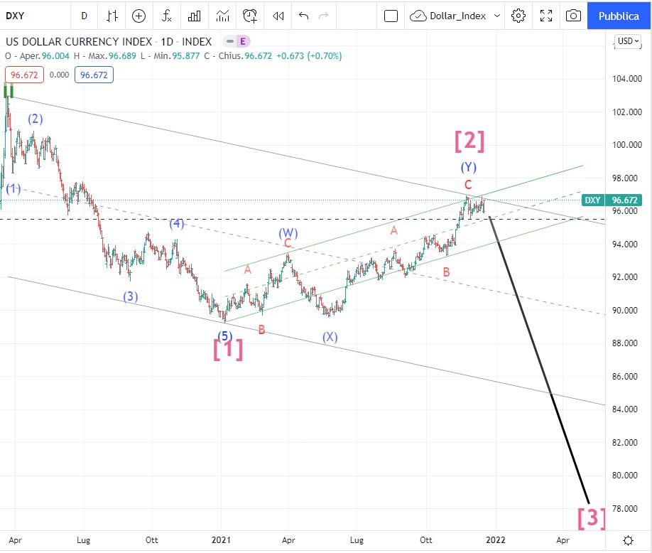 Venerdì, ultimo terzo venerdi del mese del 2021, è stato caratterizzati da una certa volatilità. Oltre ala risposta premi, viene fatto il ribilanciamento degli indici azionari, anadando a riponderare i titoli che ne fanno parte e poi la ricostituzione degli indici con aggiunte di titoli entranti e cancellazioni di titoli uscenti. Quindi è normale cohe con tutte queste operazioni abbaino determinato una giornata molto intensa con ben 17,8 miliardi di azioni scambiate. La correzione al ribasso è continuata ma è ancora presto per capire se la lettura può essere un 1-2 completo o solo l’onda [a] di 2.
