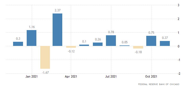 Il Chicago Fed National Activity Index, indice mensile rilasciato dalla Federal Reserve Bank di Chicago e che stima l’attività economica generale e le pressioni inflazionistiche correlate con una media di 85 indicatori macro, ha deluso passando dagli 0,75 punti di ottobre (dato rivisto da 0,76) agli 0,37 di novembre.