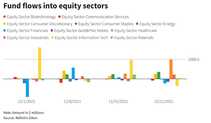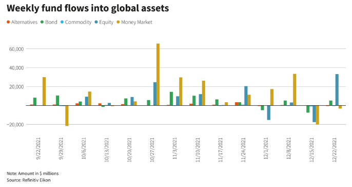 Secondo i dati Refinitiv, gli investitori hanno acquistato 33 miliardi di dollari di fondi azionari globali nella settimana terminata il 22 dicembre, rispetto a un deflusso di 13,1 miliardi di dollari nella settimana precedente.