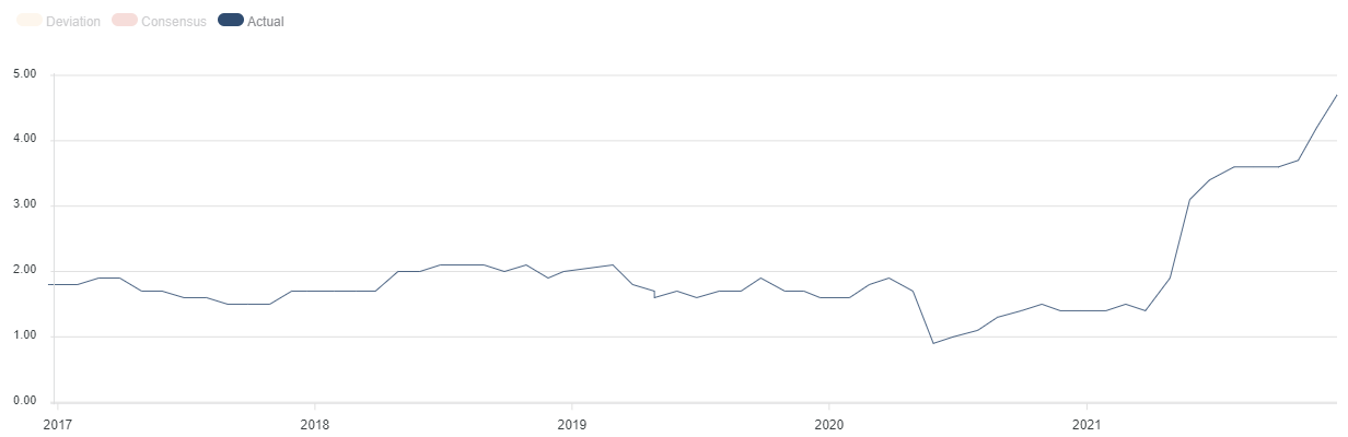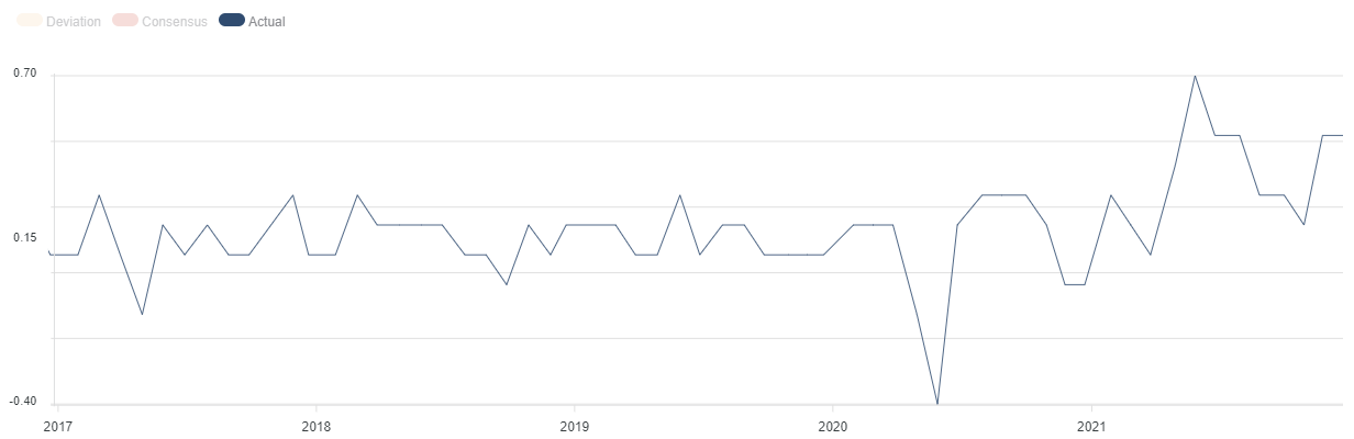 Altra sorpresa dal PCE “core”, che è uscito sopra le attese e ai massimi dal 1982. L’indice “core” (che esclude il settore del cibo e dell’energia) dei prezzi delle spese per consumi personali a livello mensile a novembre cresce dello 0,5%, ovvero appena sopra il consensus del +0,4% ed in linea con il dato di ottobre del +0,5% (rivisto da +0,4%).