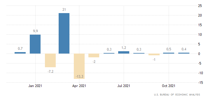 A livello annualizzato, invece, la crescita è del 4,7%, contro un consensus del +4,5% ed un dato di ottobre del +4,2% (rivisto da 4,1%). Il dato è rilasciato dall’U.S. Bureau of Economic Analysis.