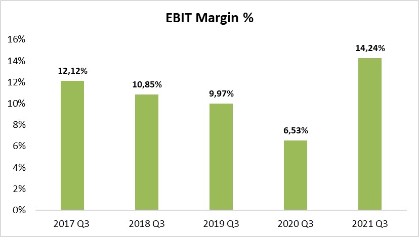 Tonico anche l’Ebit Margin % che passa da un 6,53% ad un 14,24% (miglior risultato raggiunto nel terzo trimestre): il management, ad ottobre aveva indicato il 13% come valore di lungo temine.