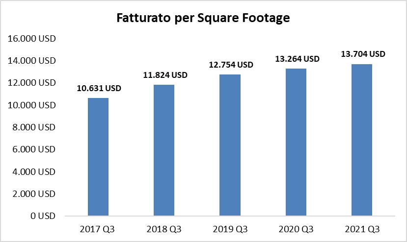 L’aumento dei ricavi si è dimostrato particolarmente virtuoso: all’aumentare dell’area di vendita (40 negozi in più) migliora il rapporto ricavi / superficie.