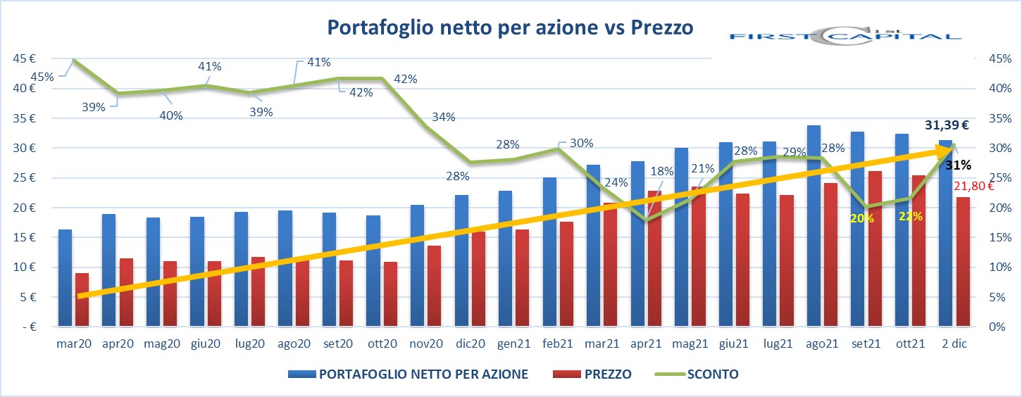 Dal grafico che segue emerge però che, il sacrificio delle quotazioni, sembra essere eccessivo: secondo una personale stima, lo sconto rispetto al NAV (tenuto conto di tutte le variazioni) si avvicina al 31%.