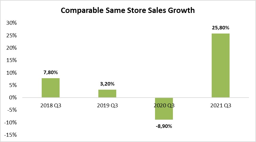 In termini relativi, il terzo trimestre ha riportato un “Comparable Same Store Sales” del 25%. Tale risultato è frutto della combinazione sia dell’aumento delle transazioni (+16,8%) sia dell’importo dello scontrino medio (+7,7%).