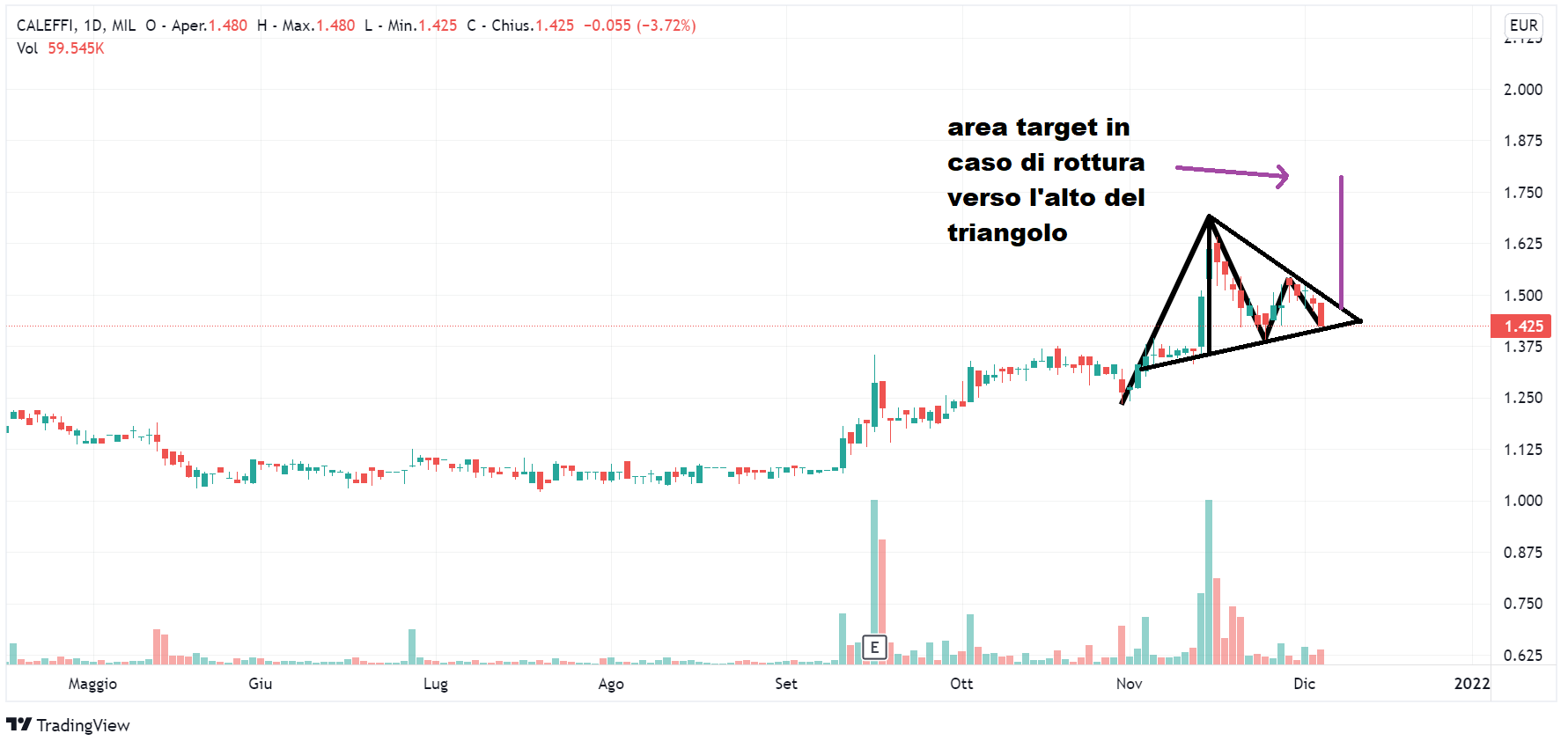 Diamo un’occhiata anche alla situazione grafica di Caleffi (venerdì Lombard Stock Index di 27), gruppo attivo nel mercato dell’home fashion con un portfolio marchi con brand di proprietà (Caleffi, Mirabello, Carrara) e brand in licenza esclusiva. Nel primo semestre 2021 Caleffi ha registrato un fatturato di 28,4 milioni di euro, in crescita rispetto ai 19,7 milioni di euro registrati al 30 giugno 2020. Nello stesso periodo si evidenzia una crescita dell’EBITDA: al 30 giugno 2020 era pari ad 1,6 milioni di euro, mentre al 30 giugno 2021 è di 3,9 milioni di euro. Ma ora vediamo come si presenta il titolo sul grafico. Dopo una lunga lateralizzazione tra metà maggio ed inizio settembre, il titolo ha iniziato a salire intorno al 10 settembre, manifestando un’evidente spinta verso l’alto tra il 12 ed il 15 novembre. Proprio in corrispondenza della seduta del 15 novembre, con una quotazione di 1,69, troviamo il primo massimo di un triangolo simmetrico. A seguire il 24 novembre si tocca una quotazione di 1,39, che rappresenta il primo minimo. Si risale fino a 1,54, in data 29 novembre: ed ecco il nostro secondo massimo. Venerdì 3 dicembre è stato toccato quello che, per il momento, è il secondo minimo del triangolo, con una quotazione di 1,425.