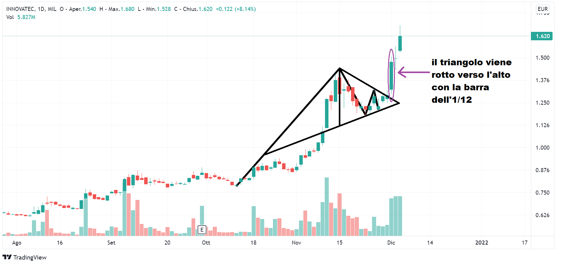 Nell’ultimo articolo avevamo parlato anche di Innovatec (venerdì Lombard Stock Index di 67) spiegando come il titolo stesse mostrando un movimento interessante, un triangolo in formazione, indicando due massimi ed un minimo. Il triangolo in questione formato dai massimi decrescenti di 1,44 e 1,32 (rispettivamente del 15 novembre e del 25 novembre) e dai minimi crescenti di 1,182 e 1,21 (rispettivamente del 23 novembre e del 26 novembre) è stato rotto verso l’alto il 1° dicembre, con la quotazione che ha raggiunto un massimo di 1,506. Anche nei giorni successivi abbiamo assistito ad un rialzo e venerdì è stato toccato un massimo di 1,68.