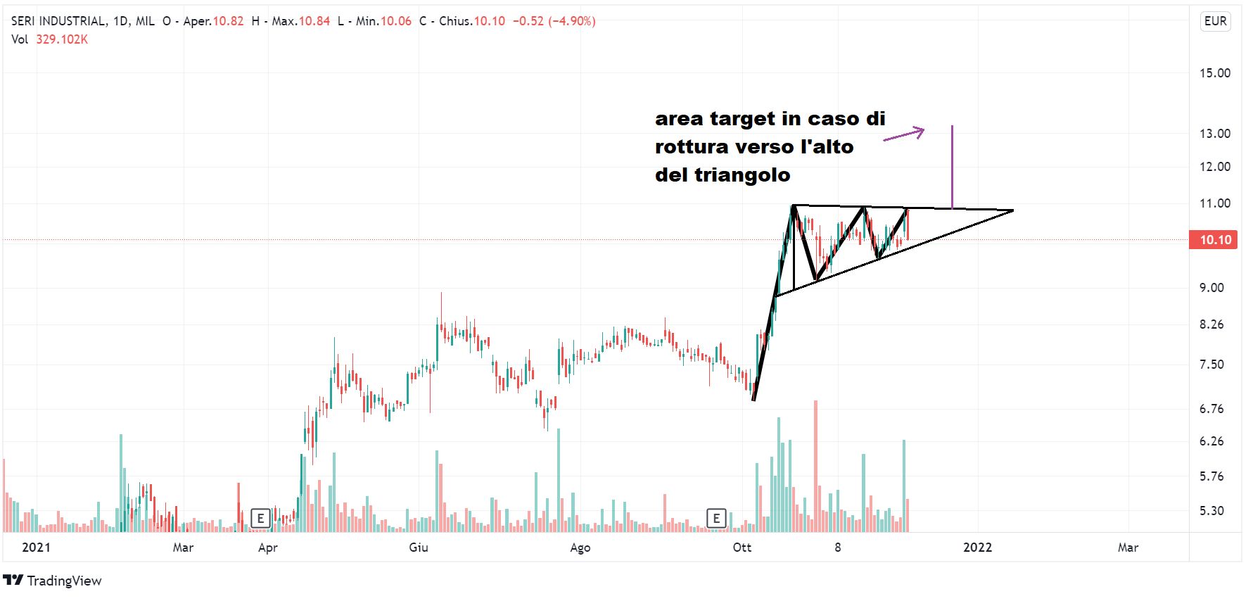 Ancora presente sulla lista del Lombard Stock Index e ancora presente nella nostra rubrica. Di chi si tratta? Di Seri Industrial (venerdì Lombard Stock Index di 35). Nell’ultimo articolo eravamo andati a correggere il tiro rispetto all’analisi fatta in precedenza, evidenziando la presenza di un triangolo “sporco” con massimi decrescenti quasi allineati di 10,94 (20 e 21 ottobre) e 10,88 (17 novembre) e minimi crescenti di 9,16 (29 ottobre) e 9,66 (23 novembre). La lateralizzazione non si è fermata andando ad aggiungere quello che per ora si può indicare come il terzo massimo di questo triangolo “sporco”, ovvero la quotazione di 10,84 del 2 e 3 dicembre. Notiamo anche che i tre massimi sono sì decrescenti, ma praticamente allineati.