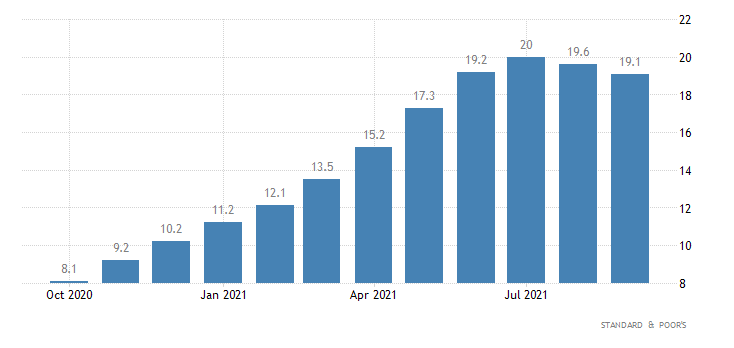 Lo S&P Case-Shiller Home Price di settembre a livello annualizzato cresce del 19,1%, vale a dire meno di quanto previsto dal consensus (19,3%). Ad agosto era stato registrato un +19,6% (rivisto da 19,7%). Il dato è rilasciato da Standard & Poor’s.