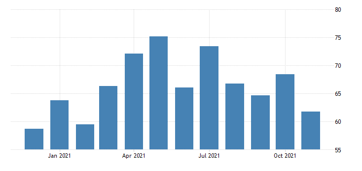 Decrescita significativa per il Chicago PMI, che dai 68,4 punti di ottobre è passato ai 61,8 punti di novembre (livello comunque elevato). Una contrazione decisamente più forte rispetto a quella indicata dal consensus, fissato a 67 punti, Il dato è rilasciato da ISM-Chicago, Inc.