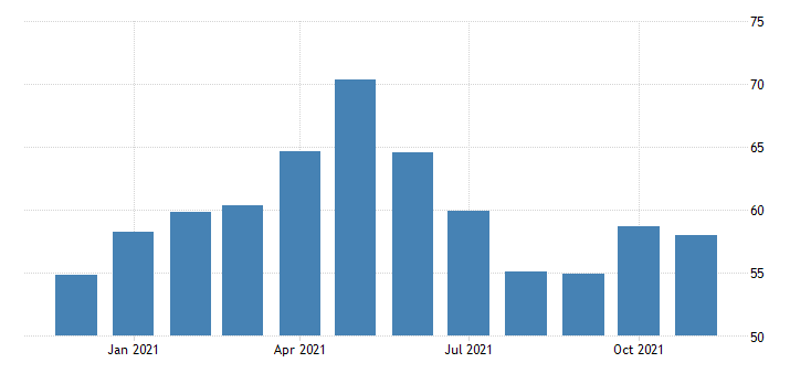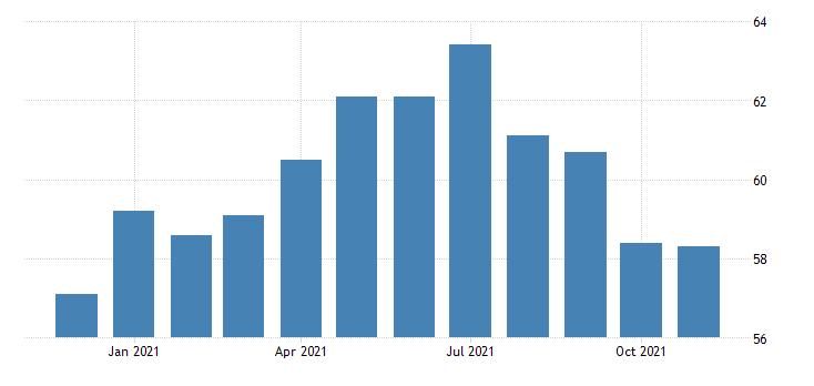 Il PMI riferito al settore dei servizi elaborato da Markit Economics a novembre registra un calo, passando dai 58,7 punti di ottobre agli attuali 58. Il dato preliminare di novembre era pari a 57 punti. Il PMI composito, sempre elaborato da Markit Economics, passa dai 57,6 punti di ottobre agli attuali 57,2; il dato preliminare di novembre era di 56,5 punti.