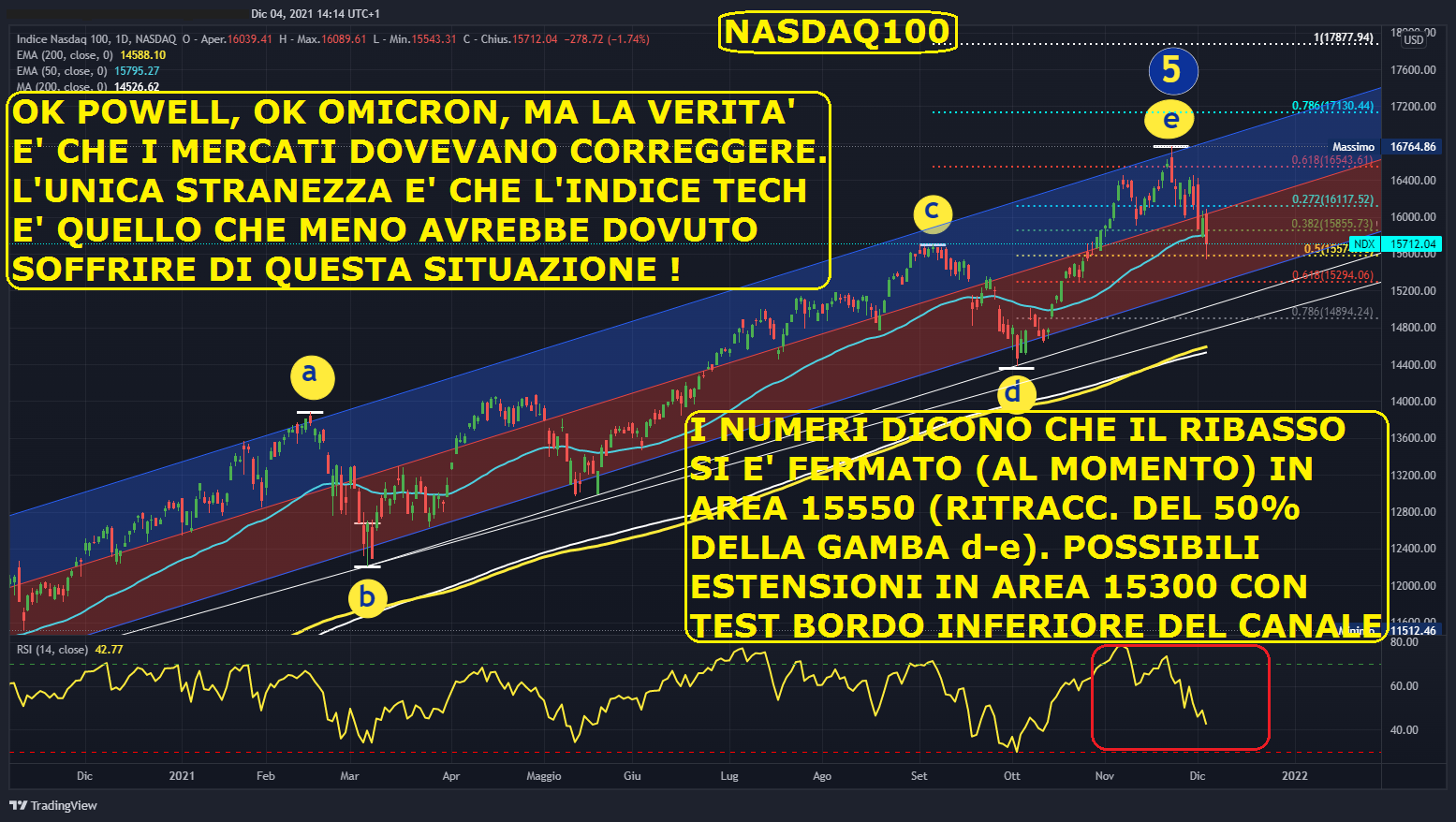 Passiamo ora all’analisi grafica del nostro indice di riferimento delle nostre operazioni, il NASDAQ100. Come riportato negli articoli precedenti, il rialzo era diventato molto tirato con l’indice che veniva aiutato solo dai titoli ad alta capitalizzazione, con una breadth del mercato intorno al 40% in diminuzione ed, ovviamente, senza una rotazione dei titoli meno capitalizzati. Quindi la discesa in atto da imputare a Powell, che è sceso a patti con Biden circa una maggiore attenzione al grado di inflazione ed alla variante Omicron del COVID, sono state solo la scusa o quantomeno, una minima parte della causa. Quello che ci lascia perplessi è che, a fronte di un forte ribasso dei rendimenti e con lo spauracchio dell’aumento dei contagi e quindi delle restrizioni, i titoli dell’indice tech avrebbero dovuto essere meno penalizzati rispetto ai titoli degli altri settori economici. Ma tant’è ! Venendo ai numeri notiamo come i primi due supporti, rispettivamente in area 16150 e 15850 abbiano retto solo per un giorno ciascuno, poi nella giornata di venerdì le vendite si sono estese fino all’area 15550 (ritracciamento del 50% del movimento d-e) per poi chiudere in area 15700. Non essendo l’indice arrivato in zona di ipervenduto, è possibile un ulteriore estensione fino in area 15300 (ritracciamento del 61,8% del movimento d-e) con test della zona inferiore del canale rialzista di volatilità. Viceversa, in caso di tenuta dell’area 15550, è probabile una reazione che riporti i prezzi in area 16000 seguita da una fase di consolidamento. La settimana si è chiusa a 15712.04 con una perdita del – 1,96% che porta l’indice ad un guadagno del + 21,91% da inizio anno 2021.