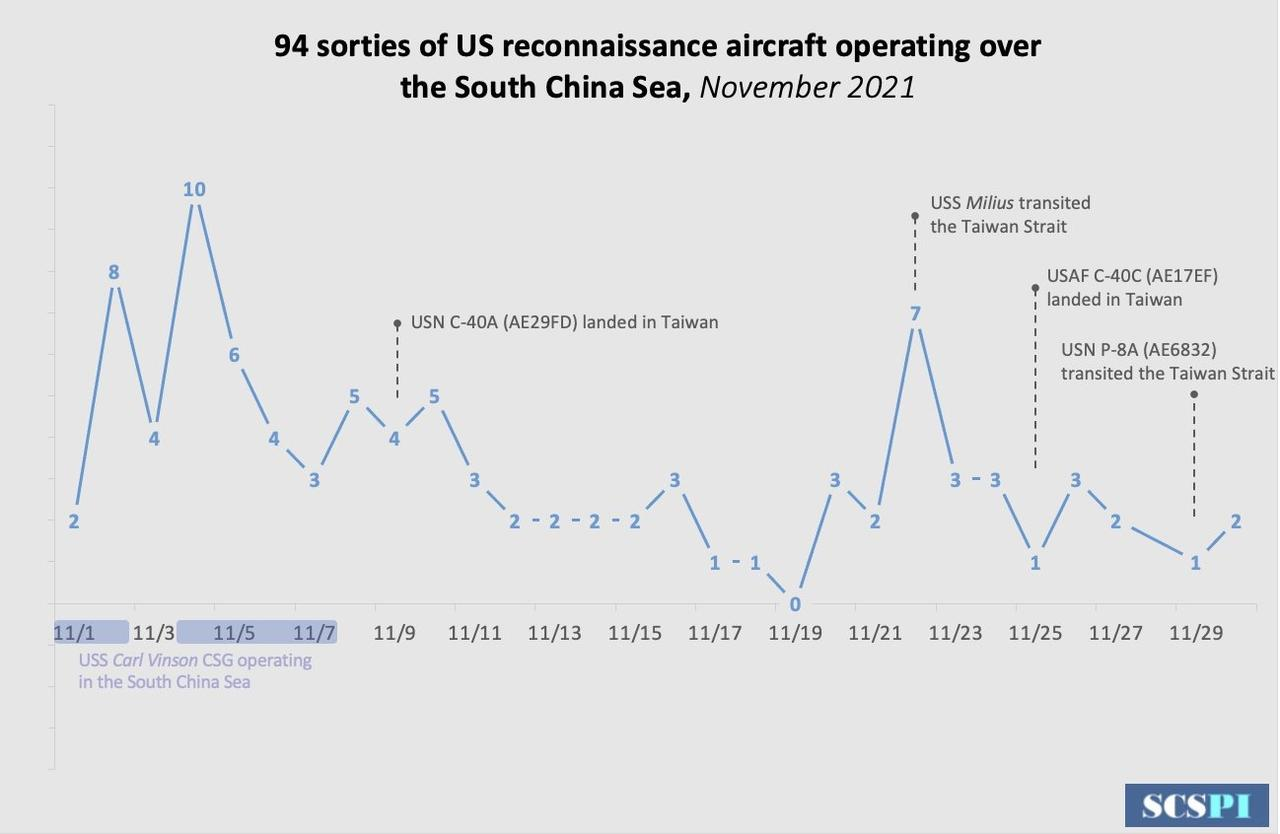 I dati di SCSPI mostrano che il giorno più attivo è stato il 4 novembre, quando gli Stati Uniti hanno schierato dieci aerei spia in tutta la regione. Lo stesso giorno, il gruppo d'attacco della portaerei USS Carl Vinson ha navigato attraverso il Mar Cinese Meridionale.